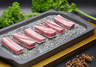 選用羔羊完整腰背連接腹部肌肉。脂肪向外,脂肪厚度0.5㎝-0.8㎝,切片后外肥里瘦,呈太陽狀,適合涮食、煎烤。