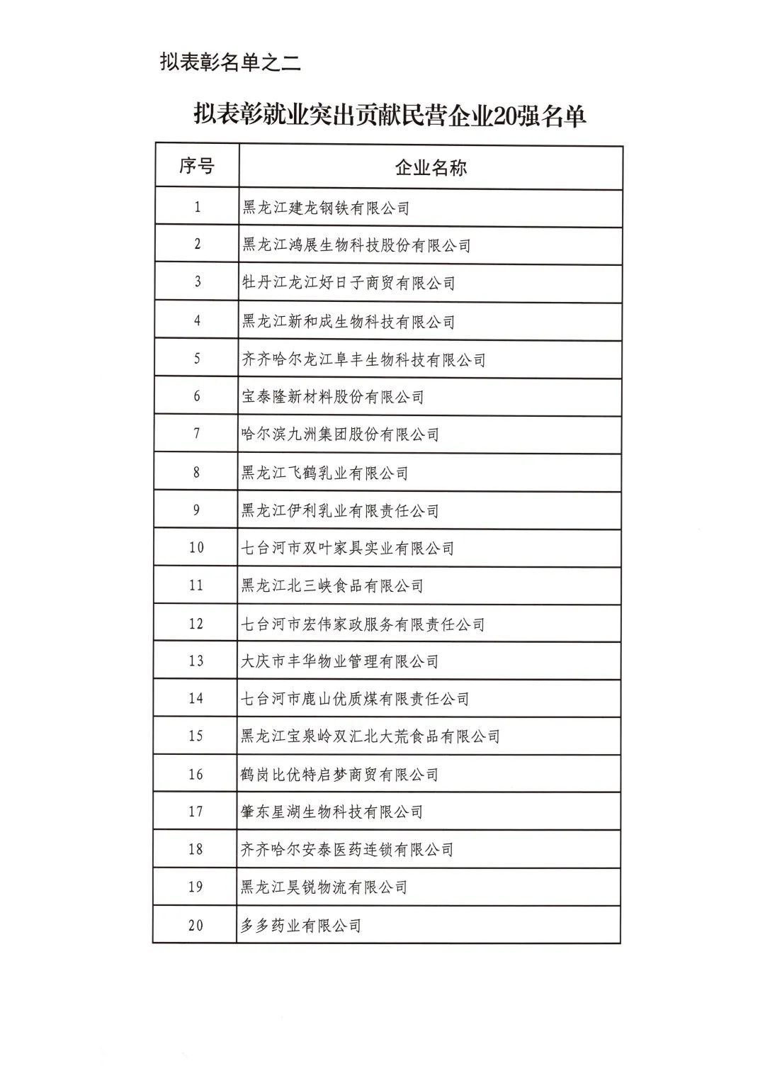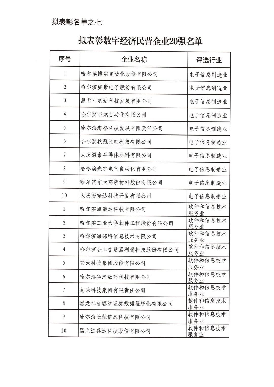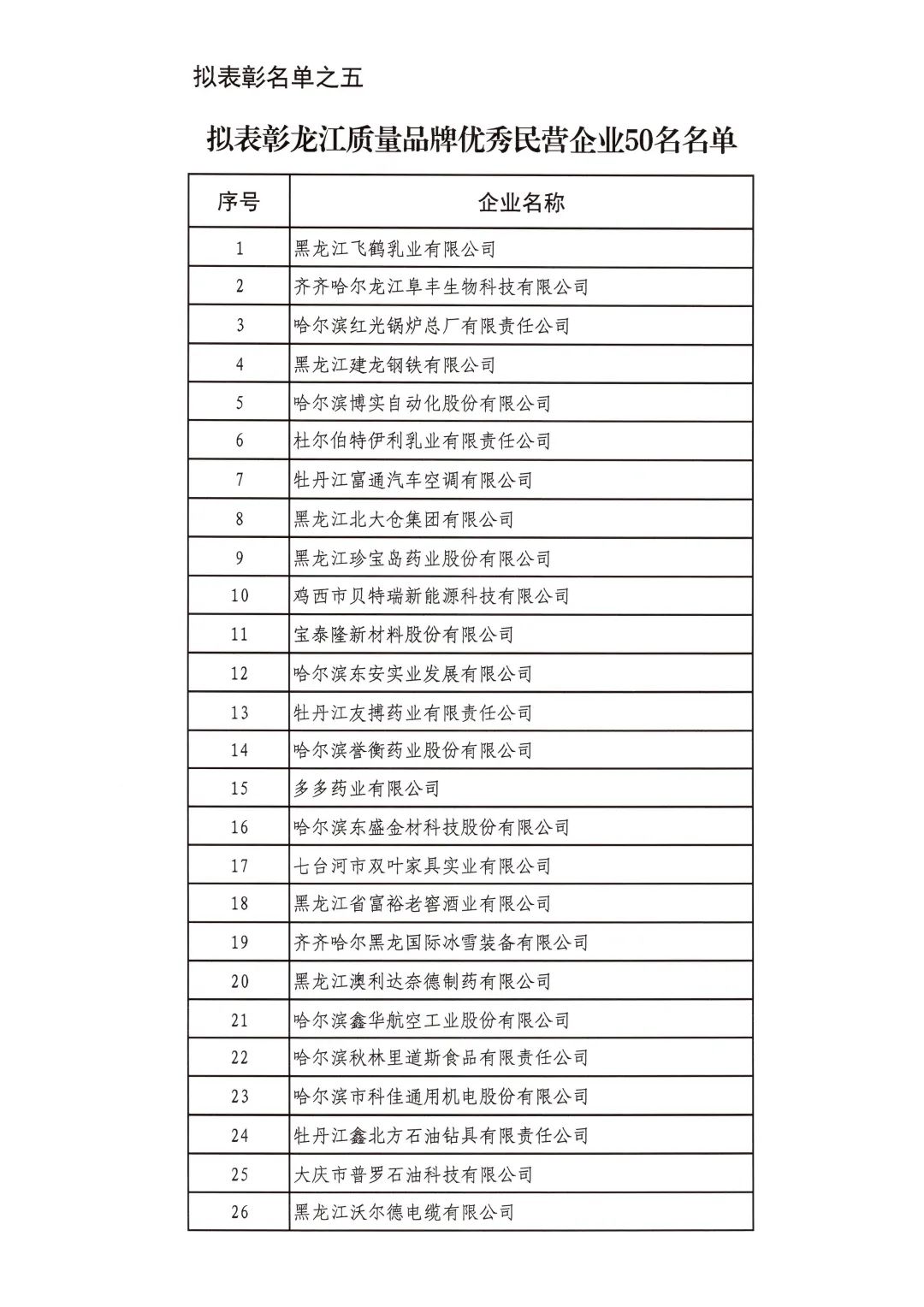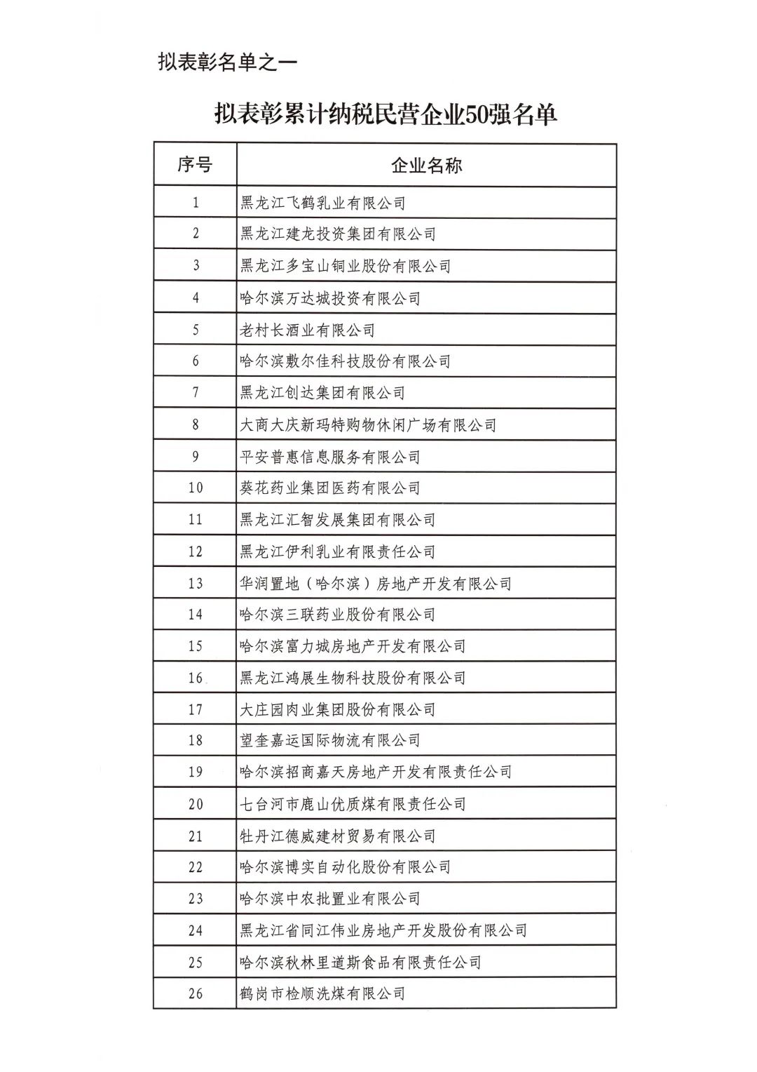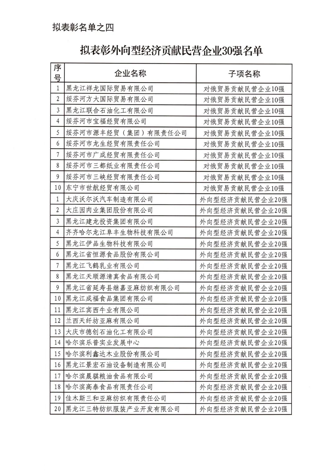 按照省委省政府關(guān)于召開全省民營經(jīng)濟(jì)大會的決策部署要求,擬對全省優(yōu)秀民營企業(yè)進(jìn)行表彰。經(jīng)企業(yè)自愿申報、市(地)把關(guān)推薦,評審小組排名,征求相關(guān)部門意見等程序,擬表彰全省累計納稅民營企業(yè)50戶、就業(yè)突出貢獻(xiàn)民營企業(yè)20戶、民營高新技術(shù)企業(yè)50戶、外向型經(jīng)濟(jì)貢獻(xiàn)民營企業(yè)30戶、龍江質(zhì)量品牌優(yōu)秀民營企業(yè)50戶、生物經(jīng)濟(jì)民營企業(yè)20戶和數(shù)字經(jīng)濟(jì)民營企業(yè)20戶。現(xiàn)將擬表彰名單予以公示。